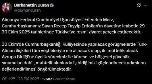 İletişim Başkanı Burhanettin Duran, sosyal medya platformu üzerinden yaptığı açıklamada, Almanya Federal Cumhuriyeti Şansölyesi Friedrich Merz’in, Cumhurbaşkanı ve AKP Genel Başkanı Recep Tayyip Erdoğan’ın davetine icabet ederek 29-30 Ekim 2025 tarihlerinde Türkiye’ye resmi bir ziyaret gerçekleştireceğini duyurdu.