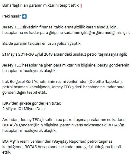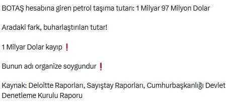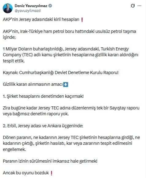 CHP’nin Kamu Yönetimi ve Yolsuzluklarla Mücadele Birimi Başkanı Deniz Yavuzyılmaz sosyal medya hesabından yaptığı paylaşımda AKP’nin Irak-Türkiye ham petrol boru hattındaki usulsüz petrol taşıma işinde bir kamu şirketi hesaplarına gizlilik kararı aldırdığını açıkladı.