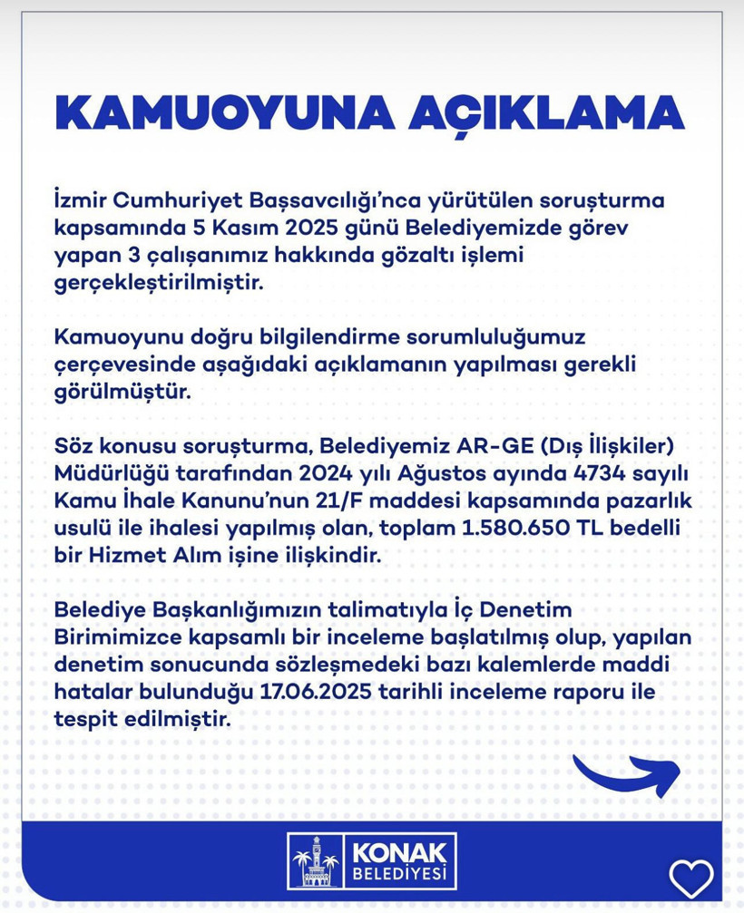 “İzmir Cumhuriyet Başsavcılığı’nca yürütülen soruşturma kapsamında 5 Kasım 2025 günü Belediyemizde görev yapan 3 çalışanımız hakkında gözaltı işlemi gerçekleştirilmiştir. Kamuoyunu doğru bilgilendirme sorumluluğumuz çerçevesinde aşağıdaki açıklamanın yapılması gerekli görülmüştür. Söz konusu soruşturma, Belediyemiz AR-GE (Dış İlişkiler) Müdürlüğü tarafından 2024 yılı Ağustos ayında 4734 sayılı Kamu İhale Kanunu’nun 21/F maddesi kapsamında pazarlık usulü ile ihalesi yapılmış olan, toplam 1 milyon 580 bin 650 TL bedelli bir hizmet alım işine ilişkindir.