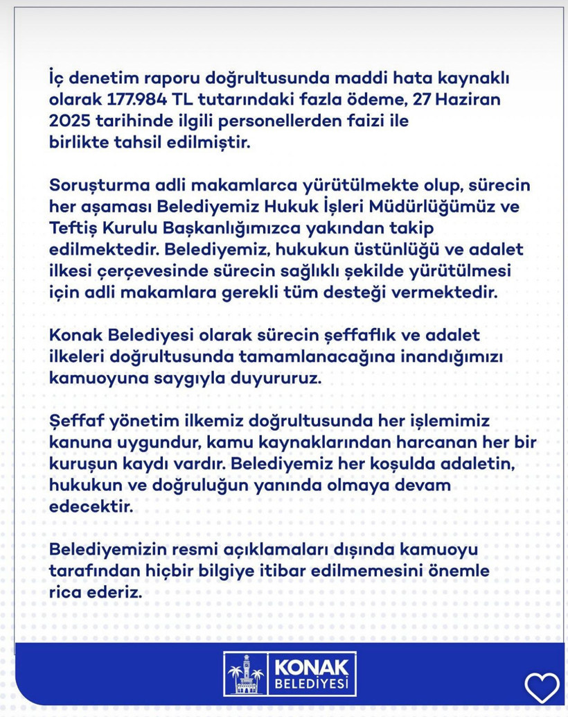 Belediyemiz, hukukun üstünlüğü ve adalet ilkesi çerçevesinde sürecin sağlıklı şekilde yürütülmesi için adli makamlara gerekli tüm desteği vermektedir. Şeffaf yönetim ilkemiz doğrultusunda her işlemimiz kanuna uygundur, kamu kaynaklarından harcanan her bir kuruşun kaydı vardır. Belediyemiz her koşulda adaletin, hukukun ve doğruluğun yanında olmaya devam edecektir. Konak Belediyesi olarak sürecin şeffaflık ve adalet ilkeleri doğrultusunda tamamlanacağına inandığımızı kamuoyuna saygıyla duyururuz. Belediyemizin resmi açıklamaları dışında kamuoyu tarafından hiçbir bilgiye itibar edilmemesini önemle rica ederiz.”