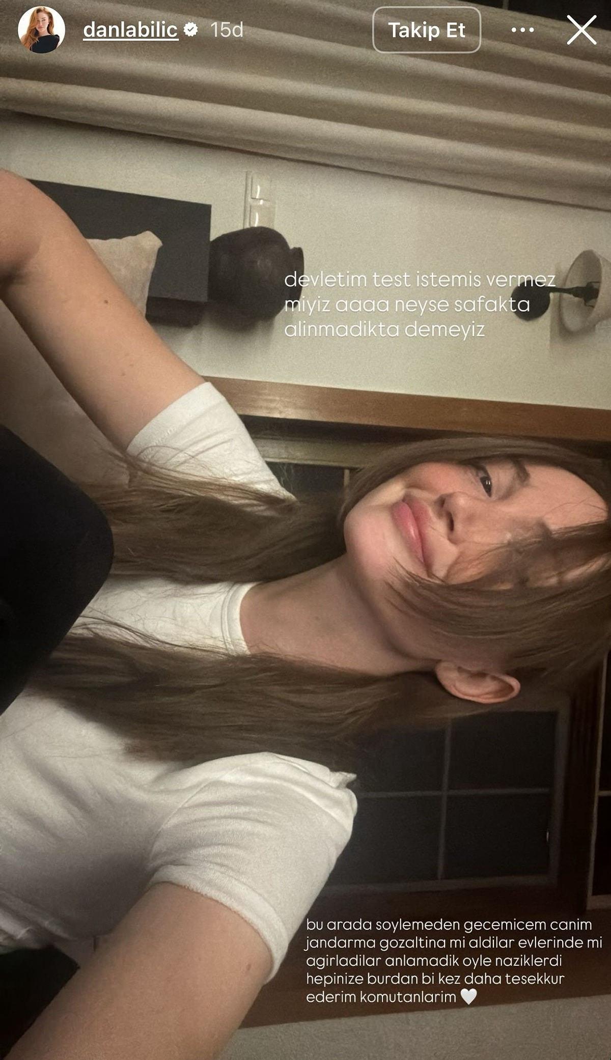 Danla Bilic açıklamasında şu ifadelere yer verdi; “Devletim test istemiş vermez miyiz. Aaaa neyse şafakta alınmadık da demeyiz. Bu arada söylemeden geçemeyeceğim canım, jandarma gözaltına mı aldılar evlerinde mi ağırladılar anlamadık öyle naziklerdi. Hepinize buradan bir kez daha teşekkür ederim komutanlarım”